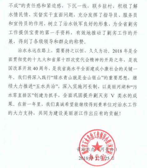 近日,浙江省五水共治工作领导小组(河长制)办公室向我校致感谢信,感谢我校派出的潘伟槐、陈建军、鲁越青、寿建昕、曹伟杰等督导员下沉一线,联乡驻村,充分发挥了指导员、服务员和宣传员的作用,树立了治水铁军良好的形象,为全省剿劣工作提供第一手资料,推动了“剿劣”工作的开展,得到各级领导和群众的称赞。 据了解,根据上级统一部署,从2017年3月份开始,学校实施校园“剿灭劣Ⅴ类水”系列工程,包括河东河西校区管网测绘工程、内河河道清淤工程、兰亭校区污水井改造等10项工程,“剿劣”工程于6月底基本完成,9月底全部完成。