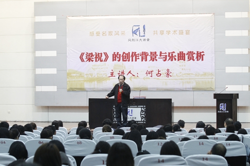 4月12日晚,中国杰出音乐家、世界著名作曲家何占豪教授做客风则江大讲堂,为现场观众作题为《<梁祝>的创作背景与乐曲赏析》讲座。何占豪教授以幽默风趣的语言讲述了小提琴协奏曲《梁祝》的创作背景,并在欣赏作品的同时,对乐曲进行了生动详尽地解析,将“音乐的本质是美,音乐的核心是情”的创作理念传递给在场的师生。