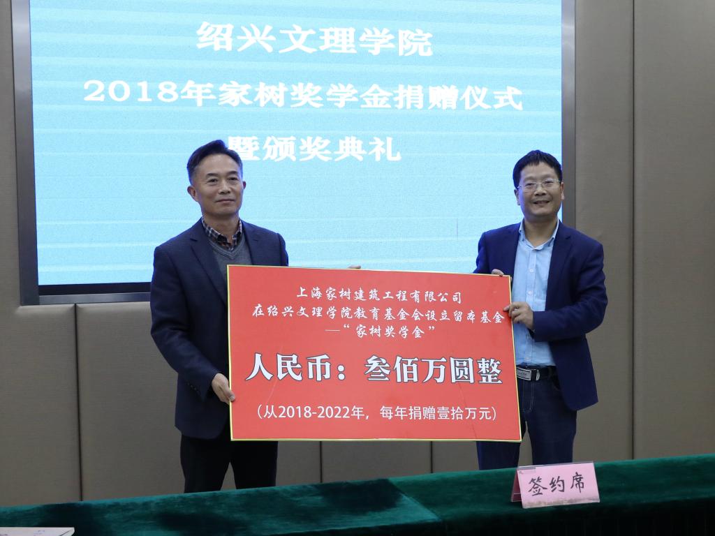 上海家树建筑工程有限公司副总经理陈军与校教育基金会相关人员签订捐赠仪式。唐和祥代表学校接受邹小锋捐赠并向上海家树建筑工程有限公司颁发捐赠证书。陈均土宣读表彰文件。上海家树建筑工程有限公司相关负责人为“家树”奖学金获得者颁发获奖证书。