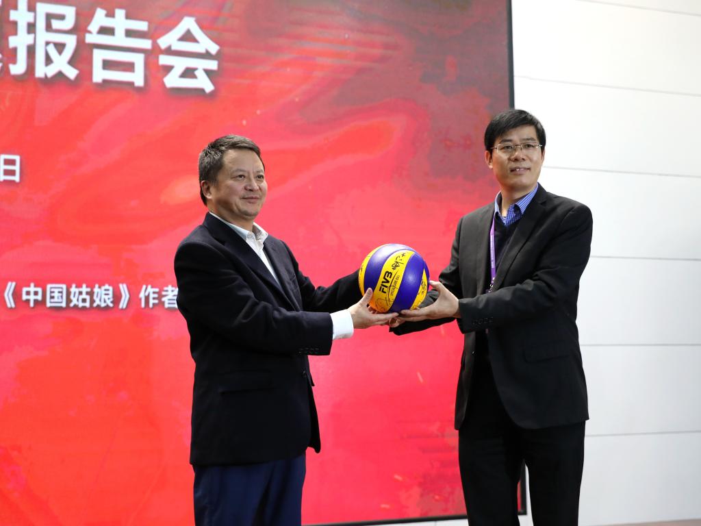 报告开始之前,吴海明向我校赠送魏纪中、陈忠和、俞觉敏等人签字的排球。
