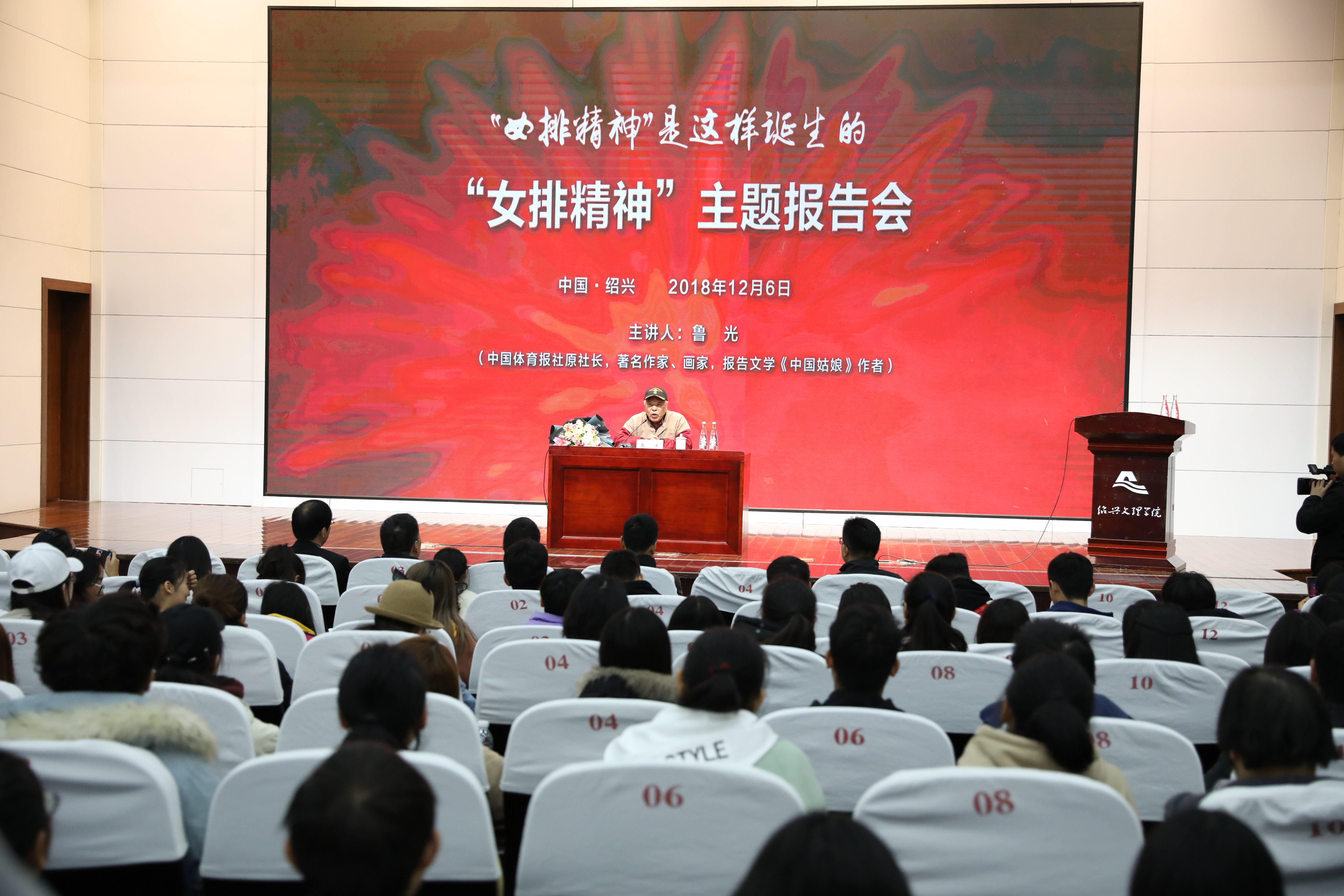 12月6日上午,中国体育报社原社长、著名作家、画家、报告文学《中国姑娘》作者鲁光在我校铁城科教馆报告厅作题为《“女排精神”是这样诞生的》报告会。中国女排原主教练俞觉敏,国家体育总局宣传司新闻处处长魏新翼,国家体育总局宣传司新闻处干部佟玲,校党委副书记沈赤,党委委员、宣传部部长陈均土,体坛报社常务副总编辑黄维参加此次报告会。绍兴市体育局党组书记、局长吴海明主持报告会。