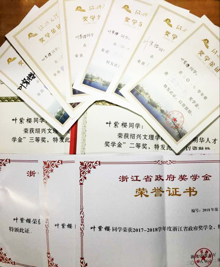 进入大学以来,叶紫樱努力平衡学业和课外活动。每天坚持早晚自习,宿舍里也摆满各种各样的书籍。作为学生会干部的她虽然工作忙碌,但综合成绩仍连续三年排名第一,并连续三年获得校综合一等奖学金。在班主任金灵老师眼中,叶紫樱是活泼又大方的女生,积极承担起班级大小活动;学习方面积极主动,并能带动其他同学共同进步。在校期间,她曾主持国家级大学生创新创业训练计划项目“青少年校园欺凌现象及应对策略研究”。在大二期间获得“第八届浙江省大学生职业生涯规划与创业大赛”二等奖,成为领奖台上为数不多的“小”选手。