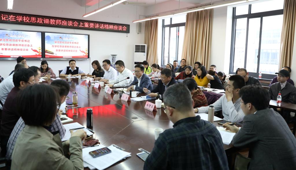 3月18日上午,习近平总书记在京主持召开学校思想政治理论课教师座谈会并发表重要讲话。3月20日下午,学校在马克思主义学院402会议室组织召开座谈会,专题学习贯彻习近平总书记重要讲话精神。校党委书记汪俊昌,党委副书记沈赤,党委委员、宣传部部长陈均土,教务处、人事处、马克思主义学院负责人出席座谈会,全校思政课专职教师、兼职教师代表和形势政策课兼职教师代表等参加座谈。座谈会由陈均土主持。
