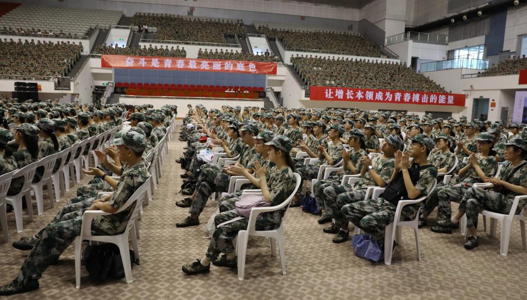 9月3日,中国人民抗日战争胜利纪念日、世界反法西斯战争胜利纪念日之际,学校2019级学生军训在河西体育馆隆重开营。2019级学生身着统一的迷彩服,以饱满的热情参加开营式,迎接为期10天的集中军事训练。