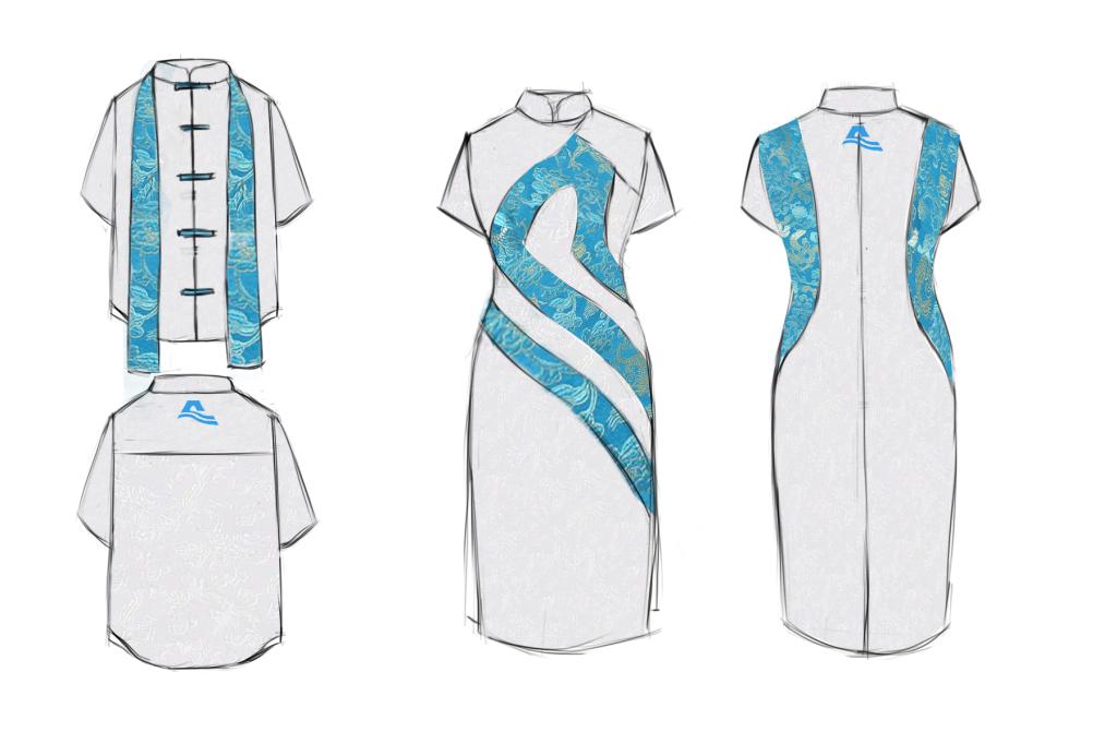 纺织服装学院衣诺坊学生负责人吴慧芳同学告诉记者,他们在暑假期间就开始准备演出服装了。“从服装的设计到面料的采购再到制作,经历了无数次的讨论和修改,最后在专业教师的指导下,最终确定男生为对襟立领五盘扣上衣,女生为斜襟中长旗袍,前片化形学校logo的拼贴图案,面料采用白色亮纹主料,蓝色绣纹面料为图案面料。”吴慧芳说。