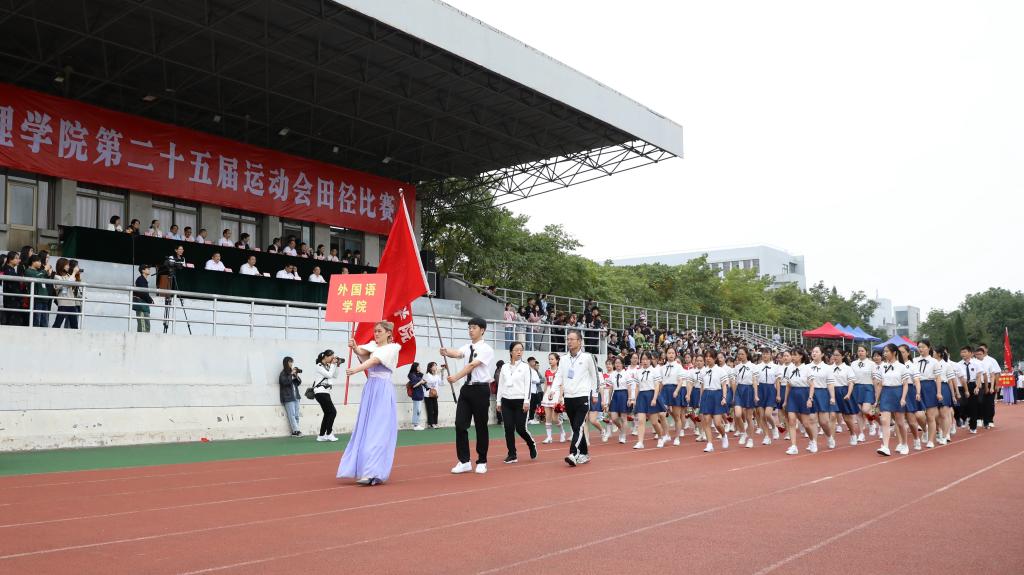 国旗、校旗、会徽,裁判员、教练员、运动员代表,16个二级学院代表队,研究生代表队和国际教育学院代表队依次入场。各入场方队极具专业特色和运动精神的展示,以及精心编排的方阵表演赢得观众台上阵阵掌声。