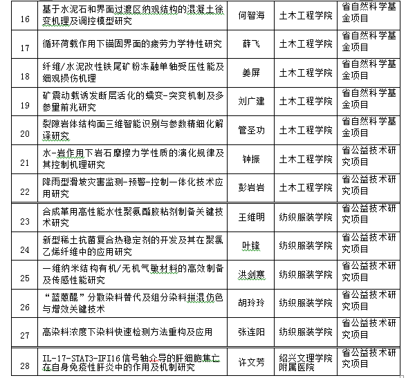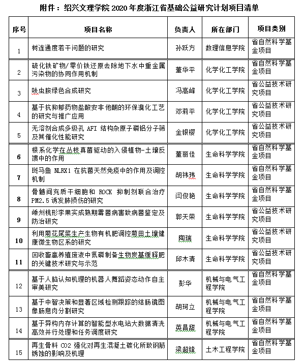 日前,浙江省科学技术厅浙江省自然科学基金委员会发文公布了2020年度浙江省基础公益研究计划项目(浙科发金〔2019〕103号)(http://www.zjkjt.gov.cn/news/node01/detail0101/2019/0101_88178.htm),我校共获准主持28项,分别是:土木工程学院8项、生命科学学院6项、纺织服装学院5项、化学化工学院4项、机械与电气工程学院3项、数理信息学院1项、附属医院1项。具体项目见附件。
