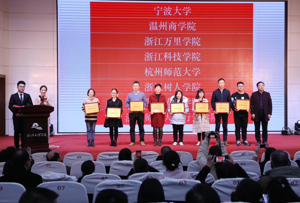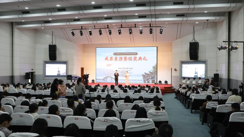 12月7日,浙江省第七届大学生中华经典诵读竞赛成果展示暨颁奖典礼在我校铁城科教馆报告厅举行。浙江省教育厅党委委员、副厅长丁天乐,浙江省语委办主任、省教育厅教材管理处、语言文字应用管理处处长朱鸿飞,湖州师范学院副校长舒志定,丽水学院副校长蒋黎红,我校副校长柳国庆,绍兴市教育局党委委员、副局长、市语委办主任、绍兴市大学生中华经典诵读竞赛组委会主任丁初效,浙江传媒学院宣传部、统战部部长陈永斌,浙江工业职业技术学院副校长陈齐苗,浙江越秀外国语学院副校长魏小琳,杭州师范大学钱江学院副院长温怀德,浙江省语言文字工作者协会副秘书长、杭州市语言文字培训中心主任王强,浙江省语言文字工作者协会副秘书长、绍兴市大学生中华经典诵读竞赛专家委员会主任孙国范,省内参赛高校(本、专科院校)负责学科竞赛的教务处领导、优秀指导教师、领队代表出席仪式。颁奖典礼共分为寄语、收获、展望三个篇章。