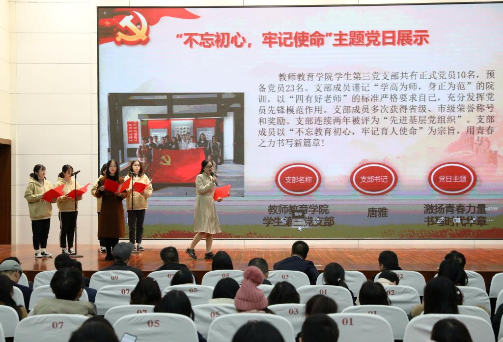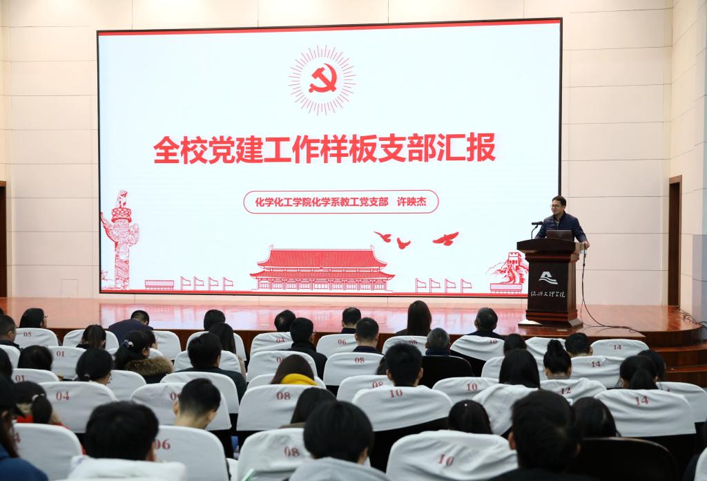 医学院党委、元培学院纺织服装与艺术设计系党总支、数理信息学院应用统计系教工党支部、土木工程学院岩土工程系党支部、化学化工学院化学系教工党支部等5个基层党组织负责人围绕工作基础、建设计划、预期成果、工作保障等,就本单位开展“双创”工作进行了汇报交流,教师教育学院党委和附属医院党委的党支部对主题党日进行了展示。
