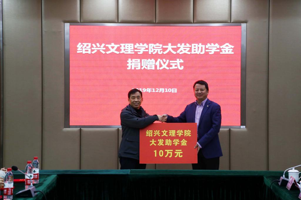 钱军代表宁波大发化纤有限公司再次向我校大发助学金注入10万元,沈赤代表我校接受捐赠。目前捐赠总额已达20万元。