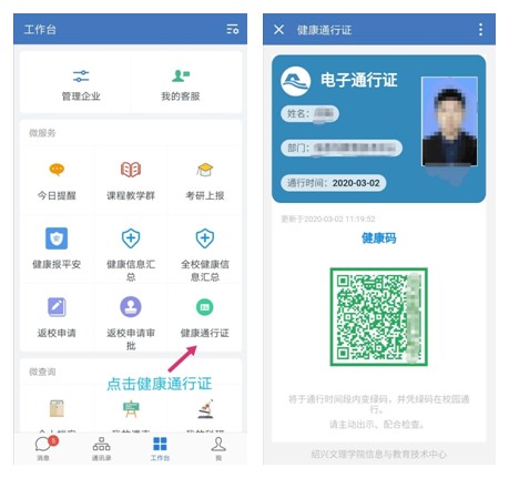 提交申请后,点击工作台中的“健康通行证”,查看审核结果,请核对个人资料、通行时间、健康码状态等信息是否正确。在进入学校时主动向学校安保工作人员出示健康通行证,扫码通过后即可入校。健康码为绿码代表正常,凭绿码可于通行时间段内在校园内通行。