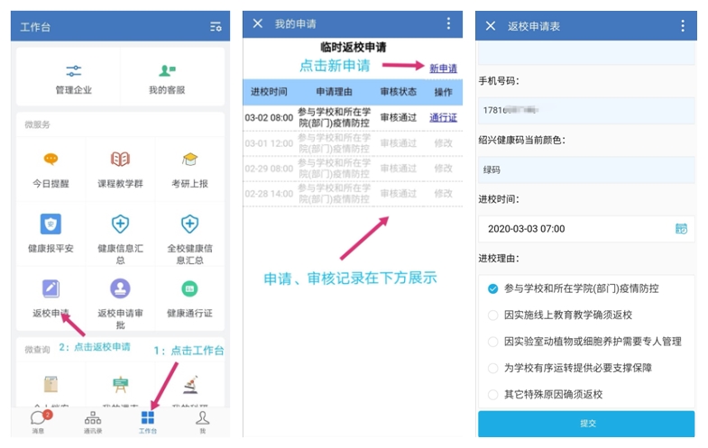 一、进入企业微信APP—>进入工作台—>点击“返校申请”进行填报,注意填写恰当的进校时间,以避免因电子通行证上的进校时间还没到而不能通行的情况。填报完成后点提交,各二级学院、部门审核人员会在手机端进行返校申请审批。