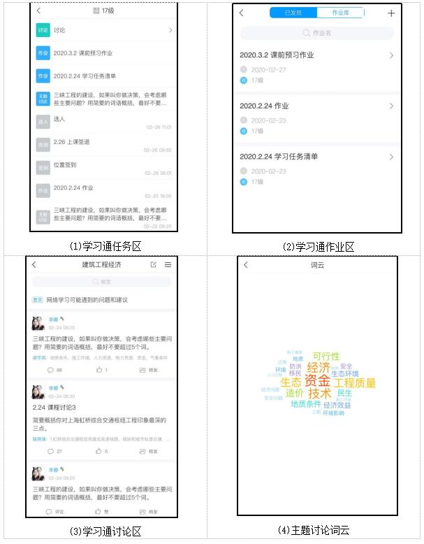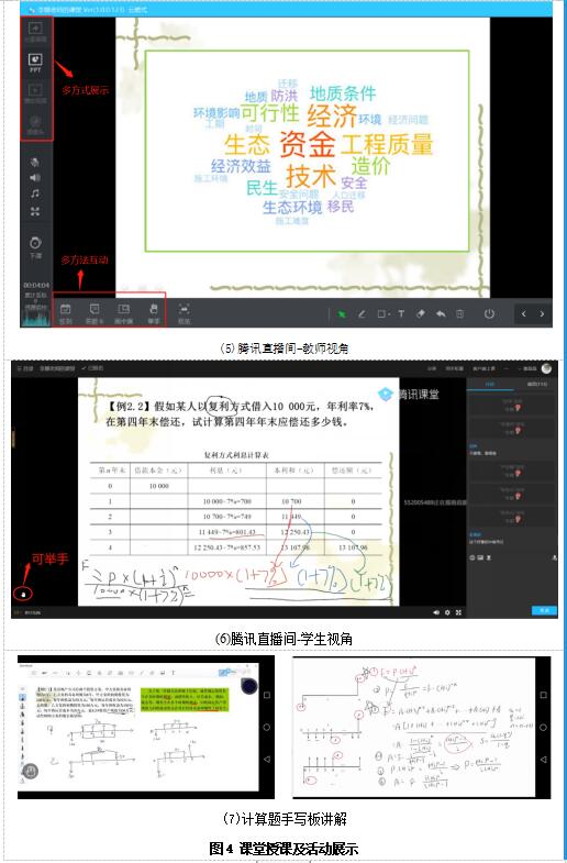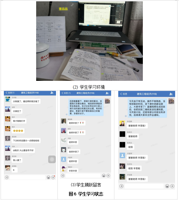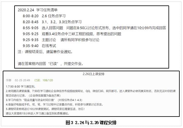 在安排的上课时间,按预定好的流程进行教师直播或学生自主学习。学习通和腾讯课堂可以开展良好的互动,如学习通的主题讨论,讨论完成后可形成词云,即时反馈;腾讯直播课堂中可进行投票、单选、多选的问题操作,可以单独连麦提问,也可以同时连麦6个同学进行讨论。直播过程中,通过PPT、视频、全屏等多方法展示授课内容,结合手写板讲解计算内容,以保证和教室上课同质等效。在课程进行中,适时使用以上方法可以有效检验学生的听课效果。另外,教师在课程进行中,也会关注企业微信群,看看学生是否有无法收看直播、讨论与测试无法参与等其他问题。