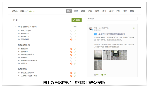 “建筑工程经济”已在云班课上运行两轮,已具备一定的资料积累。本次根据学校统一部署,在超星泛雅上搭建学习平台,线上平台建设已基本完成,后期部分新的教学资源将上线更新。图1为超星泛雅平台上的建筑工程经济课程首页。