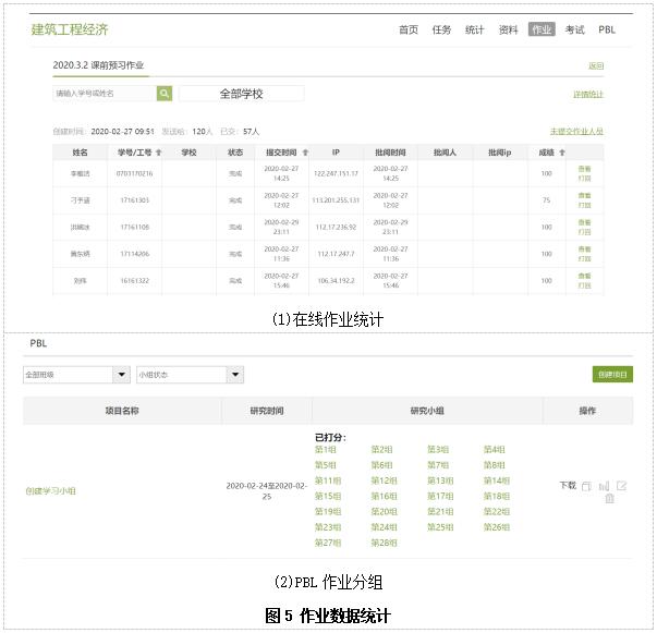 直播互动不能很好的记录每一位同学的课堂参与情况,因此超星泛雅平台的建设不能忽略。通过平台的任务点布置、签到、选人、作业发放、PBL学习小组等功能,可以更好地从统计数据中分析学生的学习状况,对学习数据不佳的学生及时给予关注。通过测验与考试的统计数据分析,可轻而易举的找到学生学习的薄弱地,从而进行重点讲解。