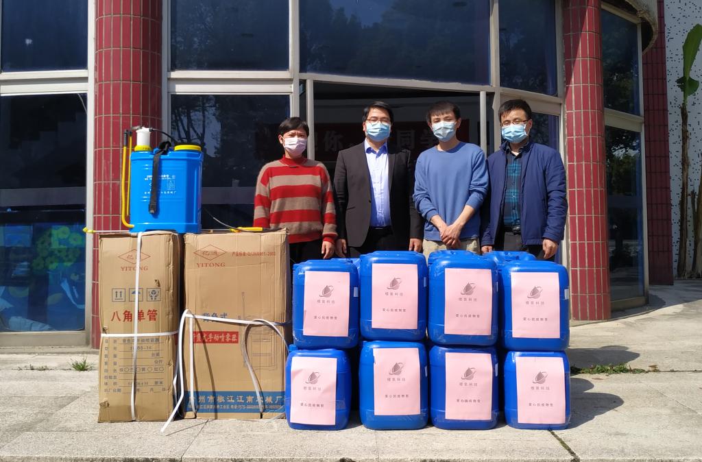 3月20日上午,机械与电气工程学院电气151班侯宇航校友代表其所在的绍兴橙氧科技有限公司向我校捐赠400升氯酸钠(84主要成分)消毒原液、10套消毒喷洒器,主要用于校园内办公楼、教学楼、学生公寓、餐厅等公共区域的消毒防疫,助力学校复工复学。