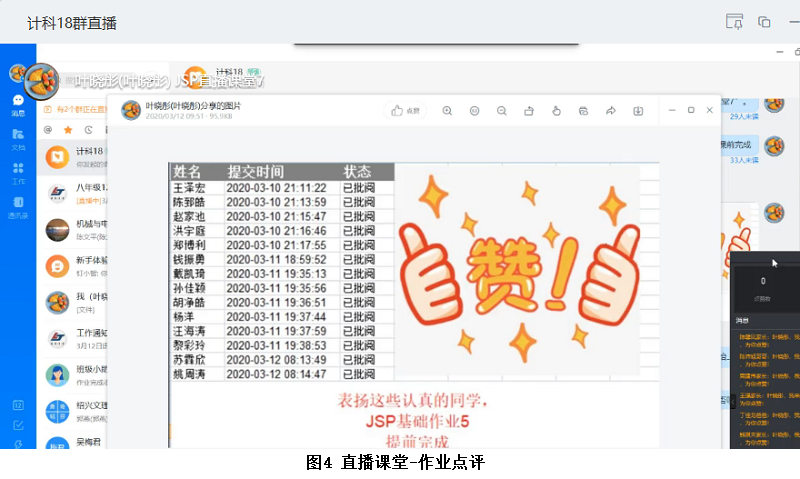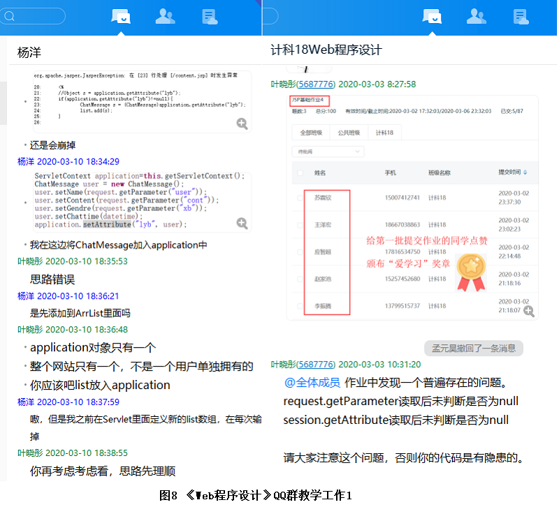 因为是网络教学,做好学生课后学习的引导与督促,也是十分重要的教学环节。本课程对班级学生进行了分组,每组4位学生,由一名学习能力和态度较好的学生担任组长,小组长统计作业任务的完成情况,本组全部完成后在QQ群发信息。通过这种QQ群消息的模式,侧面督促学生作业进度。教师在省教学平台查看作业上交情况,一般在作业截止前一天,在QQ群发消息,点名表扬这些学习积极的学生,从而激励学生们的学习热情。