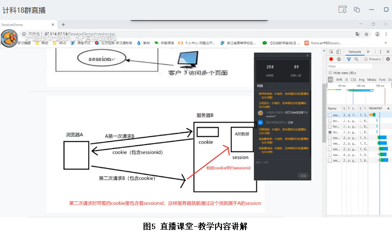 课前10分钟,开始钉钉直播,播放音乐,开启课前签到。上课时间到,先试音,确保学生听清楚后再按照预先打印好的直播备课单开始直播。本课程主要在Web开发工具中进行操作演示和代码分析。直播过程中的提问和讨论采用钉钉直播群里文字形式,一般简单问题用选择题,让学生发1,2,3,4形式的答案选项,这种形式参与度高,效率高。直播结束,导出学生签到表和直播听课时长表。