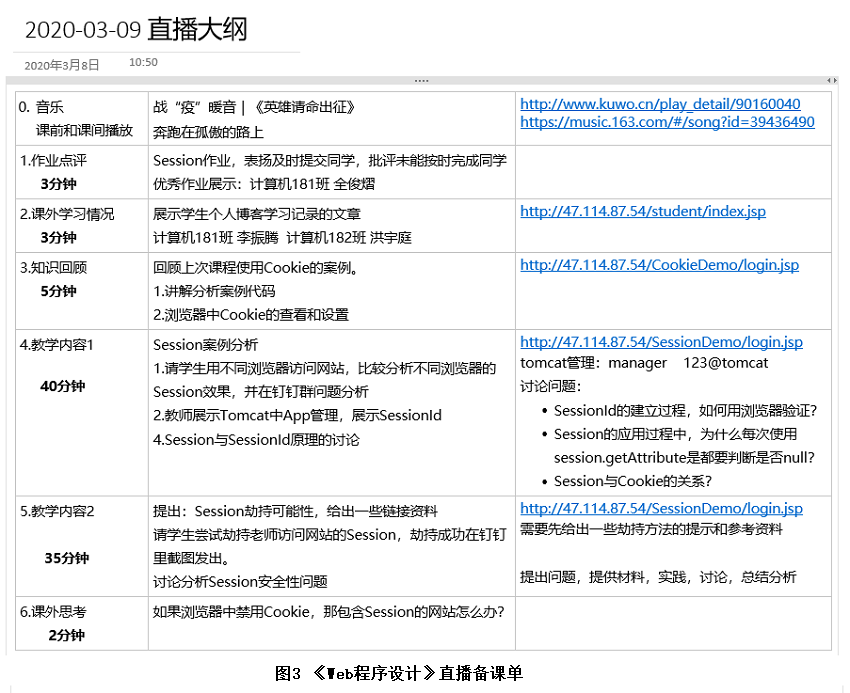 学生完成了预习作业,老师也应该相应完成一份直播备课单的任务。课程直播,对我们所有教师来说都是一次挑战,再充分的准备也不为过。因为对课程内容是熟悉的,那么准备工作就集中于直播课堂的过程设计以及时长的控制上面。直播过程中不可控因素较多,所以设计上需要多准备一些教学内容,在直播过程中做减法比较容易。另外,最好把直播中需要使用的课件、图片、网址等素材单独放在电脑桌面的文件夹里,确保直播过程的操作流畅。图3为本课程一份直播备课单。