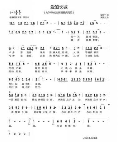 2.歌曲介绍,了解本节课所学曲目《爱的长城》创作背景,此曲为艺术学院黄耀文老师应学院党委要求为新冠肺炎创作的作品。分析歌曲调性调式、旋律特点及创作结构。