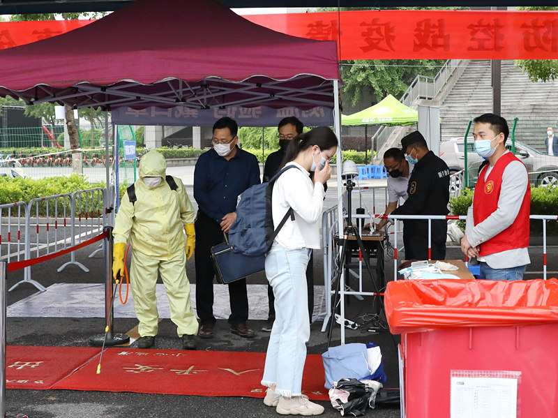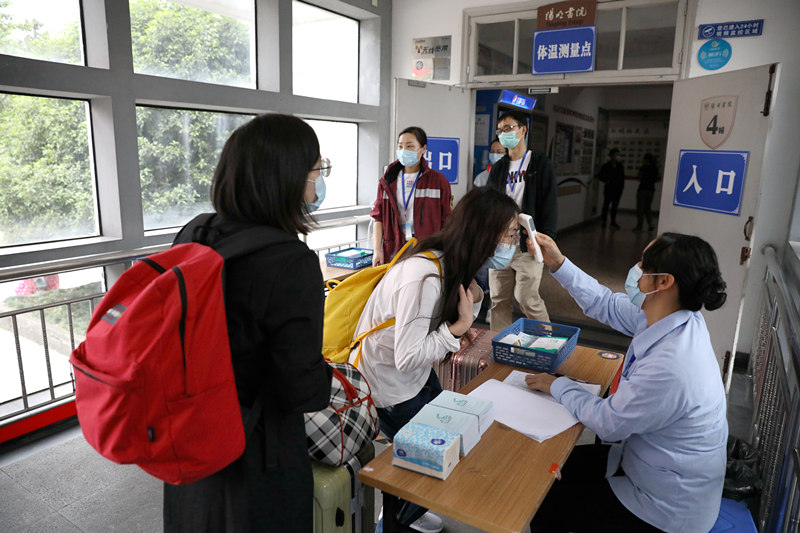 学校实行人流错时错峰抵校和校门口交通协调,自驾车辆即停即行,学生下车后立即进入专有通道。经过身份核实、两次体温检测、手部清洁消毒、更换口罩核验等程序,学生即可入校。进入校区后,工作人员和志愿者们帮助学生搬运行李,核验登记后进入宿舍。