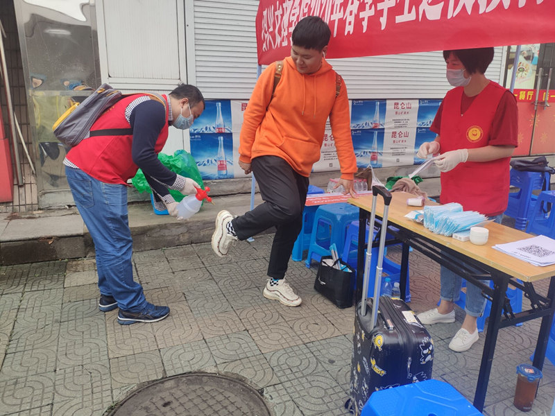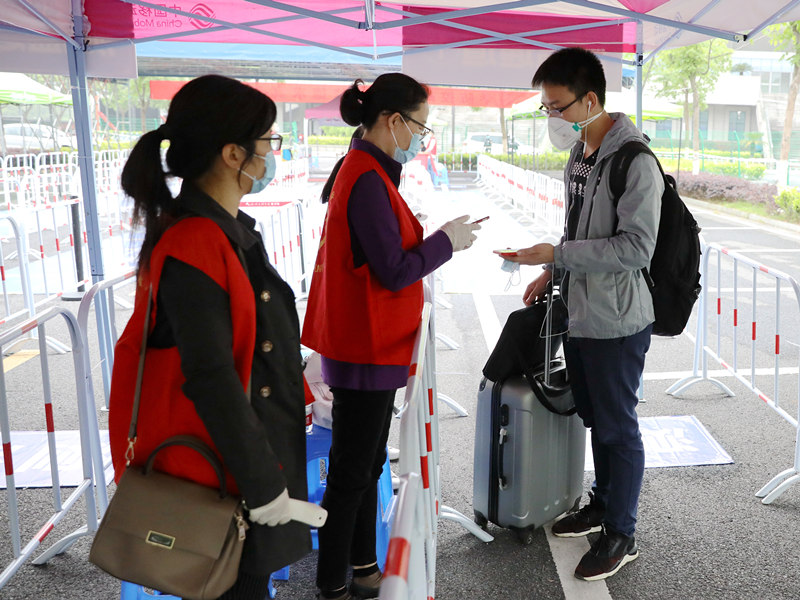 在风则江校区、南山校区,学校机关党委联合新宇物业全天候轮流值岗,全天志愿服务服务超12小时,提供防疫指导和返校咨询,维持报到现场秩序。