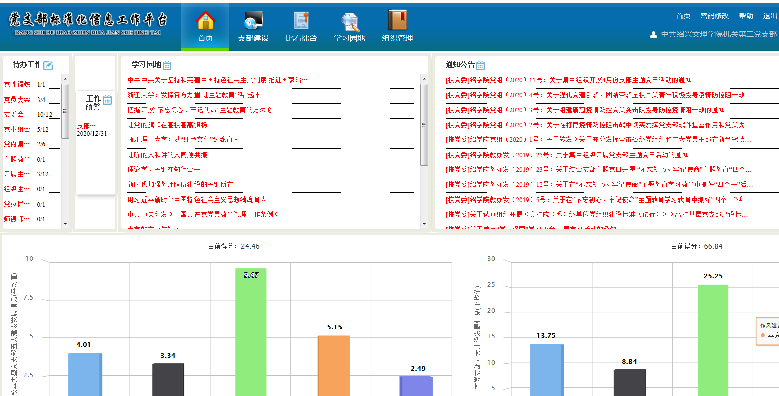 除此以外,信息工作平台实现了常规工作“远程化”,新增的“述职评议”板块,通过线上完成了全校20个二级党组织书记的述职评议,80名参与评议打分的评委使用专门账号登录平台,5分钟就能完成线上评议,不到1天时间,平台管理员登录平台发现,述职评议结果已经完全清晰呈现,与以往相比大大缩短了工作周期。近期正在开展的党支部标准化达标考评也同步实现了线上部署、考核、检查、反馈等“闭环管理”。