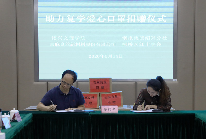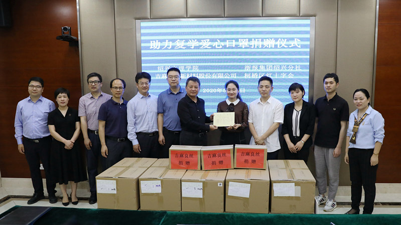 浙报集团绍兴分社、柯桥区红十字会、浙江吉麻良丝新材料股份有限公司联合发起了此次爱心口罩捐赠活动。爱心企业浙江吉麻良丝新材料股份有限公司为我校共计捐赠替换式大麻布口罩3580套共7160只、可替换芯片53700片,一次性大麻无纺布防护口罩5000只。