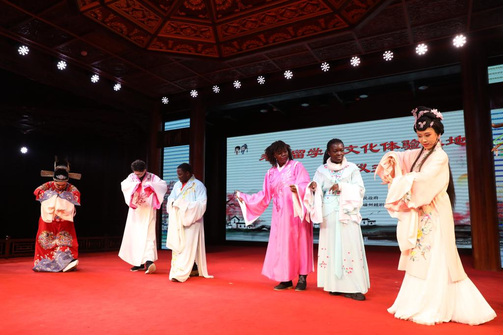 留学生们在越剧小镇古戏楼欣赏《西厢记·琴心》《碧玉簪·送凤冠》《貂蝉·拜月》等经典越剧桥段,并在互动体验环节试穿传统戏服及学唱越剧,近距离感受越剧的造型美与韵律美。
