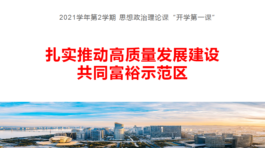 精心备课当堂“讲”。“浙江将承担高质量发展建设共同富裕示范区的重大使命,计划到2025年推动示范区建设取得明显实质性进展;到2035年,高质量发展取得更大成就,基本实现共同富裕,率先探索建设共同富裕美好社会。”2月28日下午,校领导张宏以一名普通思政课教师的身份在“开学第一课”上娓娓说道。课堂上,张宏结合自身的工作经历生动介绍了浙江作为共同富裕示范区的现实背景、丰富内涵和发展举措。据悉,本学期52名专兼职思想政治理论课教师将分别深入124个教学班开展“扎实推动高质量发展建设共同富裕示范区”的“开学第一课”。