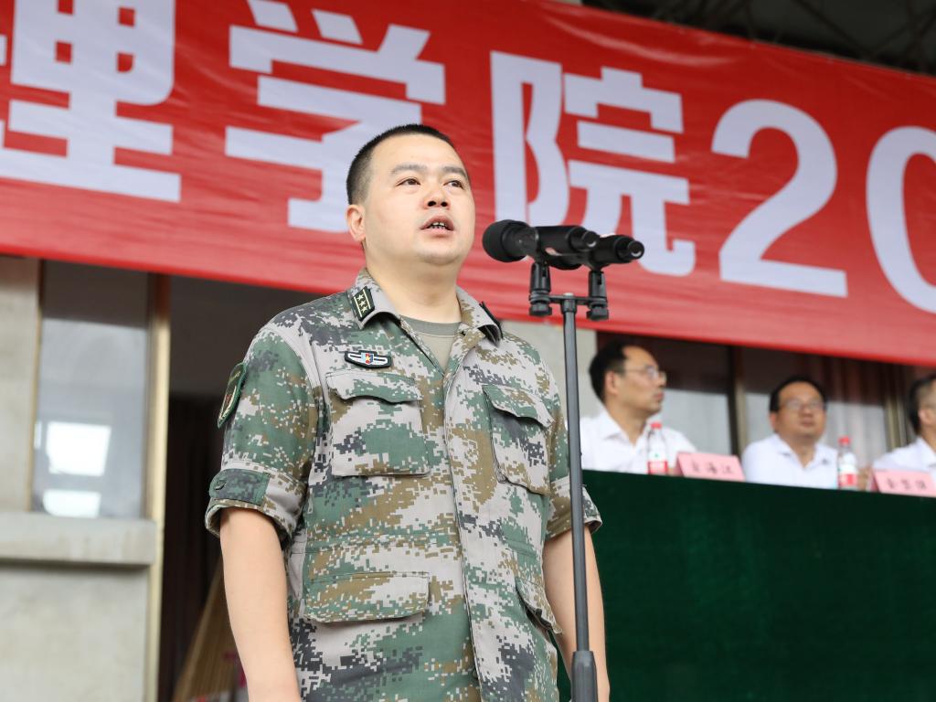 军训团教官代表顾宇彬发言,他对本次军训工作做出保证:从自我做起,以良好的军人形象带领大家,以过硬的军事本领引导大家。