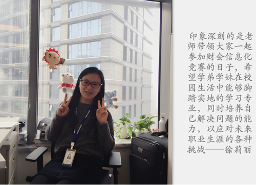 徐莉丽,会计2012届毕业生,中国注册会计师(CPA)。毕业后就职于立信会计师事务所(特殊普通合伙)上海总部,现任天健会计师事务所(特殊普通合伙)杭州总部、高级项目经理。主要负责公司上市业务,曾参与多个IPO项目,此外也参与多家大型企业的年度审计工作。