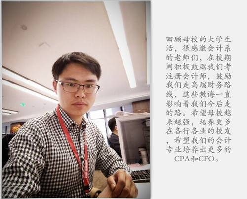 徐锋,2011届毕业生,中国注册会计师(CPA),国际注册内部审计师(CIA)。历任长江精工钢结构股份有限公司助理会计、会计;现任杭州热联集团股份有限公司财务专管员、子公司财务经理,主要从事公司风险管控、资金管理、税务管控、财务分析、预算管理以及各项投资项目的决策分析。