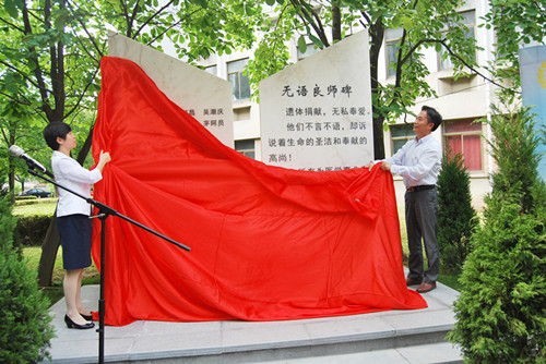 活动现场,丁晓燕和唐和祥共同为“无语良师”碑揭幕。