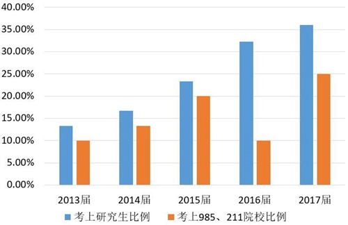 近五年考研录取率稳步提升,且考上985、211高校的毕业生比例高。