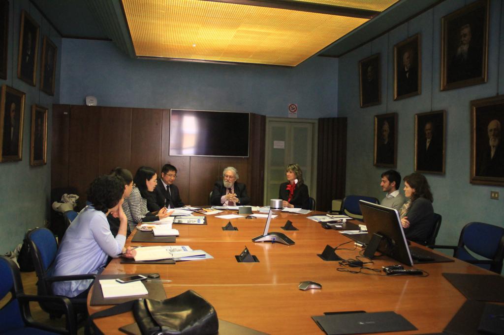 在UNIMORE,邱卫东首先向Sergio Ferrari先生对邀请我校代表团本次出访表示感谢。在听取了我校出访的目的后,Sergio Ferrari先生肯定了我校向其推出的“兰亭书法学堂”项目。他指出,自2016年学年开始,该校获意大利教育部认可,为语言和商务方向的研究生开设了高级汉语学分课程。为此,我校先后派出两批汉语言(书法)教学的师生参与该课程的教学工作,这对于意大利学生学习中国语言文字、文化及书法艺术提供了极大的帮助,他希望此合作能进一步推进。人文学院负责人表示人文学院会积极选派优秀师生参与此项目,以确保教学质量。同时,Sergio Ferrari先生对于近几年来我校外国语学院和该校语言与文化学院在学生交流方面的合作表示满意。该校国际处及语言与文化学院负责人等4人参加了会谈。