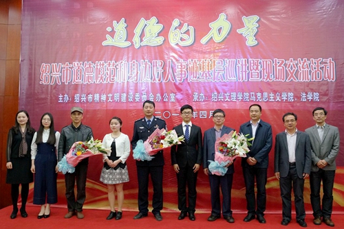 “让我们每一个人都都成为宣讲员,一传十,十传百的把道德模范事迹分享出去,让更多人的心灵为之震撼……”4月7日下午,由绍兴市文明办主办,我校马克思主义学院、法学院承办的“道德的力量”绍兴市道德模范和身边好人先进事迹首场基层巡讲暨现场交流活动在南山校区7号楼报告厅举行。第四届绍兴市道德模范范立刚、周贤人和第三届绍兴市道德模范潘旗龙参与现场交流。绍兴市委宣传部部务会议成员、市文明办副主任徐人杰,市文明办未成年人思想道德建设工作处处长车东海,我校马克思主义学院、法学院负责人,马克思主义学院、法学院师生代表参加活动。