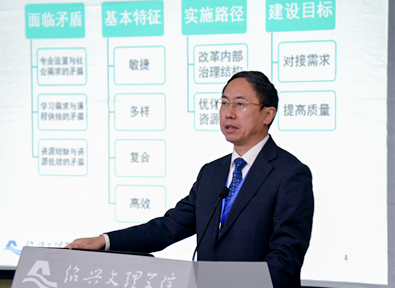 叶飞帆作了题为“基于学科制、选课制、书院制的应用型人才培养体系构建”的汇报。他回顾了学校的发展历程,并介绍了我校基于学科制、选课制、书院制的应用型人才培养体系构建——学科制着力重建基层学术组织,理顺学科与专业的关系,从而解决专业僵化、学科碎片化问题;选课制以模块化为手段,以提高效率为目标,重构课程体系,从而实现培养复合性人才、满足个性化需求、提高选修课修读效率;书院制着力整合资源,集成功能,重组学生成长环境,从而实现教学与学工协同,第一、第二课堂联动和全员育人。他表示,学校虽已取得一定成绩,但也清楚地看到存在的问题和不足,我们将以此次审核评估为契机,全面总结经验,认真查找问题,进一步突出人才培养的核心地位,提高人才培养质量。他还就核心课程的地位和作用,对“转型”、“认证”、“章程”、“综改”的认知和实施,转型发展中解决的核心问题等回答了专家组的提问。