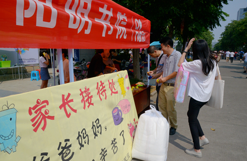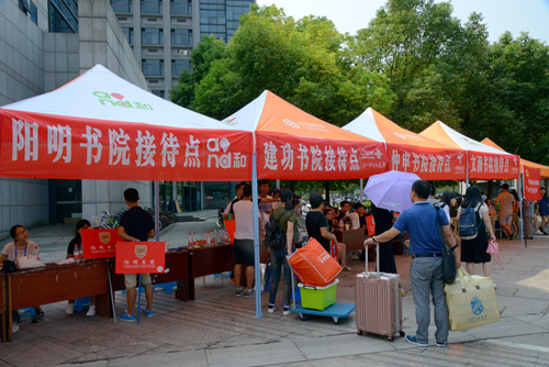迎新当日,天气比较炎热,校园临时搭起了一顶顶清新的帐篷,上面注明新生签到处、生活用品领取处、家长服务点等,以方便新生及家长办手续或休息纳凉。此外,学校设置专车往返车站进行不间断接送,在校门口以及校园主要道路上都有工作人员或学生志愿者驻点举牌,提供咨询服务等。