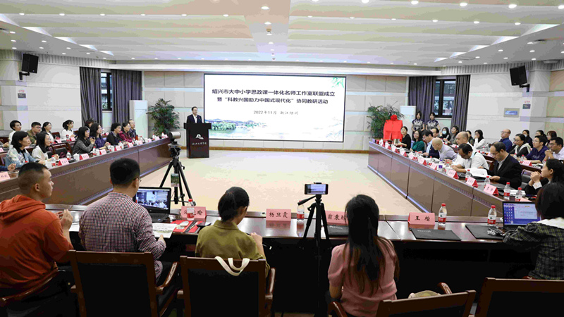 为加快推进习近平新时代中国特色社会主义思想进教材进课堂进头脑,搭建绍兴市大中小学思政课教师队伍建设的多元平台,11月11日,绍兴市大中小学思政课一体化名师工作室联盟成立暨“科教兴国助力中国式现代化”协同教研活动在校图书馆一楼报告厅举行。绍兴市委教育工委专职副书记、市教育局党委副书记马成永,绍兴市教育局政治处主任王泽权,绍兴市教育教学研究院院长赵新鸿,校党委副书记张宏,校党委委员、宣传部部长梁瑜,各名师工作室负责人和骨干教师,绍兴市各学段教研员,大中小学和马克思主义学院师生代表等参加会议。活动由梁瑜主持。