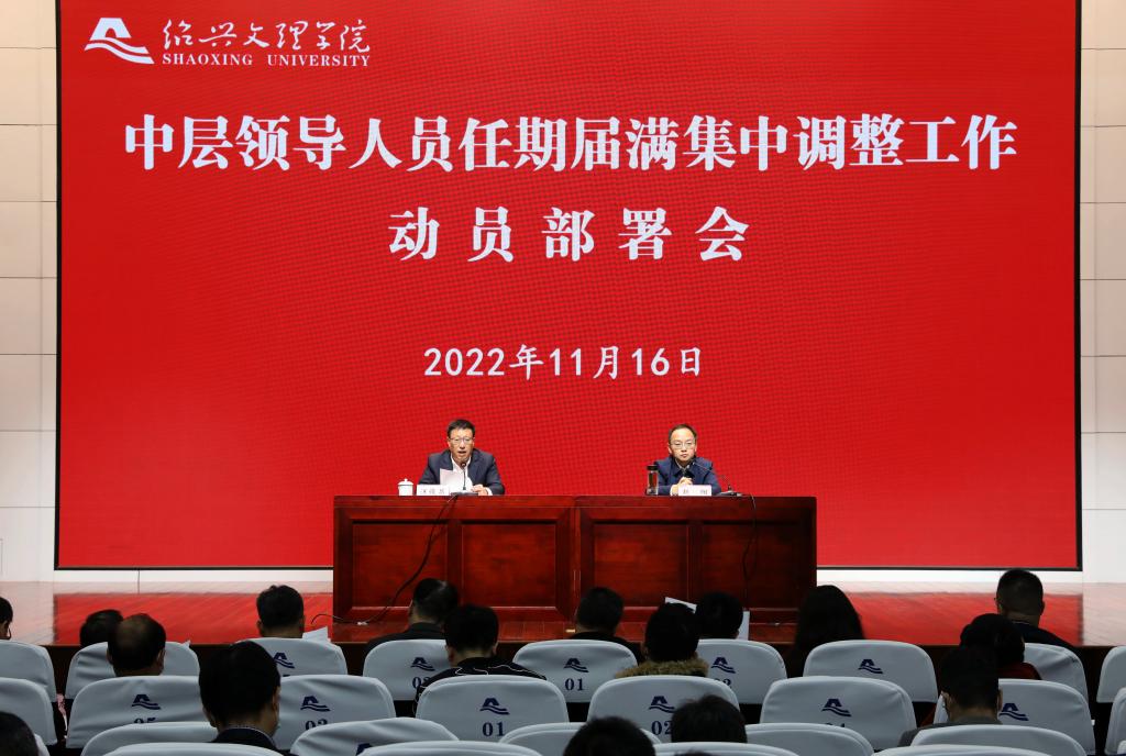 11月16日下午,我校在铁城科教馆一楼报告厅召开中层领导人员任期届满集中调整工作动员部署会。校党委书记汪俊昌作动员部署讲话,校长赵阳主持会议。校党政领导班子成员,全体中层干部,民主党派和统战团体负责人,省市“两代表一委员”,部分校党代会、双代会、高层次人才代表参加会议。