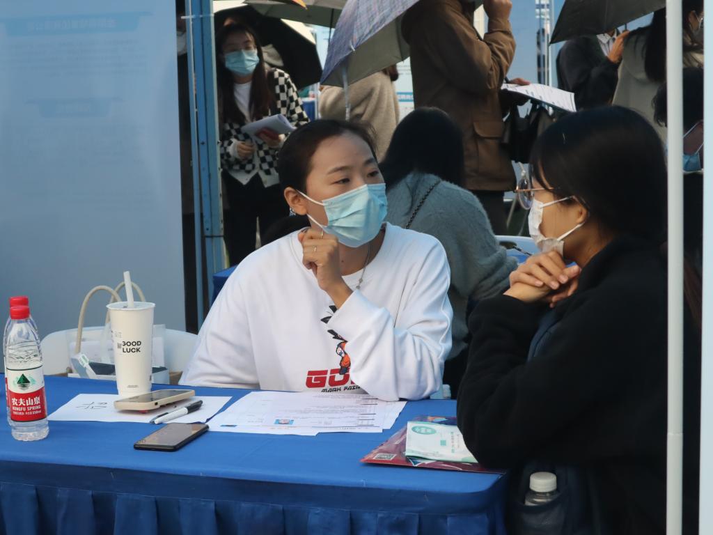 下午2点,招聘会现场人头攒动,通过查验两码、佩戴口罩、测温后,前来应聘的大学生有序进场。提前入场的各用人单位HR早已在现场等待,毕业生们拿着精心准备好的自荐书和简历接踵而至,在各企业展位间穿梭,认真研究企业招聘简章,表达求职意向,并主动向企业展示自己的综合能力。用人单位详细了解大学生情况,介绍公司福利待遇与竞争优势,耐心地为大学生们答疑解惑。