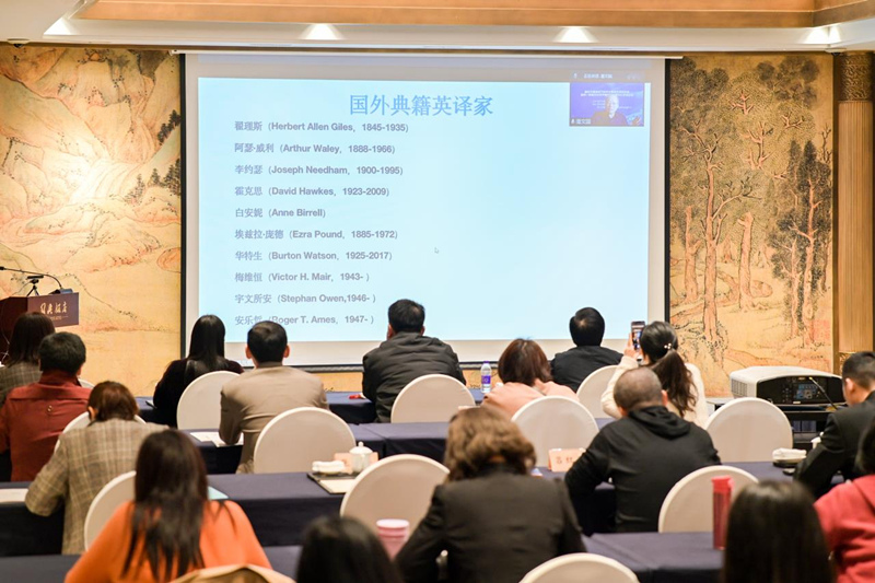 开幕式后,潘文国就《典籍翻译的下一步》作主旨报告。辛红娟以《科研选题的可持续性与可延展性——以文化典籍译介与传播为例》为题作报告。