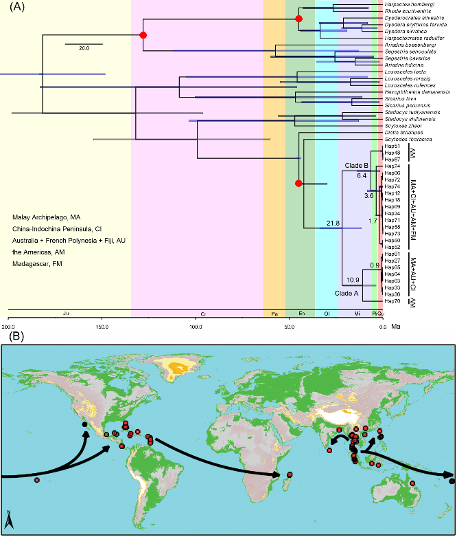 近日,我校罗育发教授与中科院动物所李枢强研究员合作,在国际著名生态学和保护生物学期刊《Ecography》(1区Top,IF = 6.8)以及国际著名进化生物学期刊《Cladistics》(1区Top,IF = 7.1)上,发表世界花皮蛛科蜘蛛系统演化领域的重要研究成果。