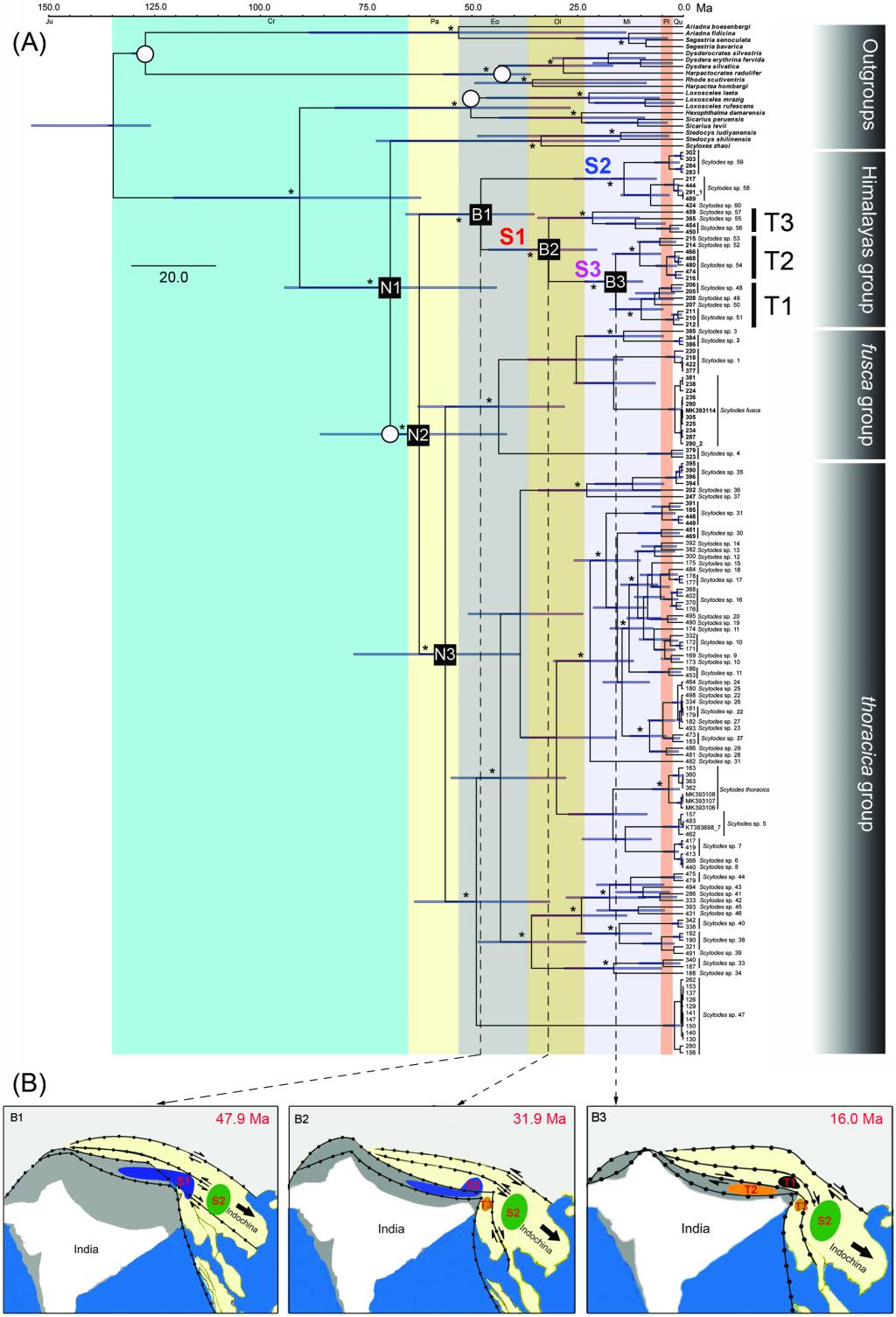 课题组还聚焦花皮蛛属Scytodes东南亚特有区系多样性的形成,基于分子系统学、历史生物地理学等方法研究高海拔分布的花皮蛛种组Himalayas group的分布格局及其形成机制,揭示印度—欧亚板块逐级碰撞和喜马拉雅逐级抬升是东南亚高山花皮蛛多样性形成的重要驱动力。该成果发表在进化生物学领域Top期刊《Cladistics》上。链接:https://onlinelibrary.wiley.com/doi/10.1111/cla.12512。