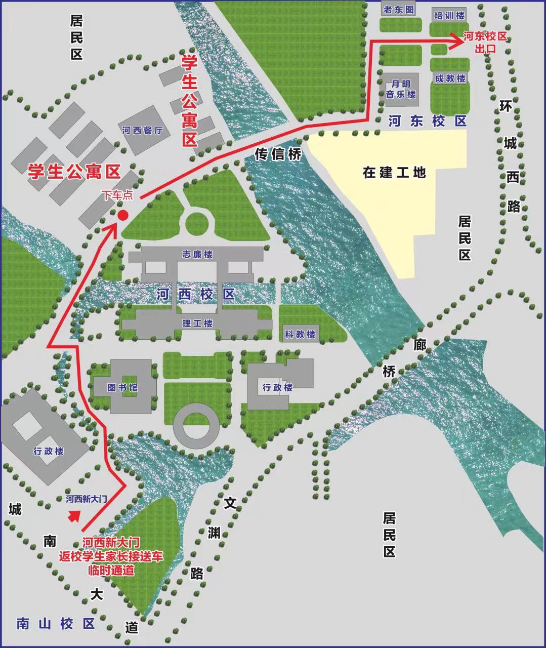 5.乘坐私家车返校的学生,车辆沿专用通道到达指定位置后服从管理,即停即走。学校在进校区与公寓之间安排了志愿者及行李搬运专用车,如需校内搬运,请提前在家做好行李贴。风则江校区入口为河西新大门,出口为河东校区大门;南山校区入口为正大门东侧门,出口为加油站侧门。