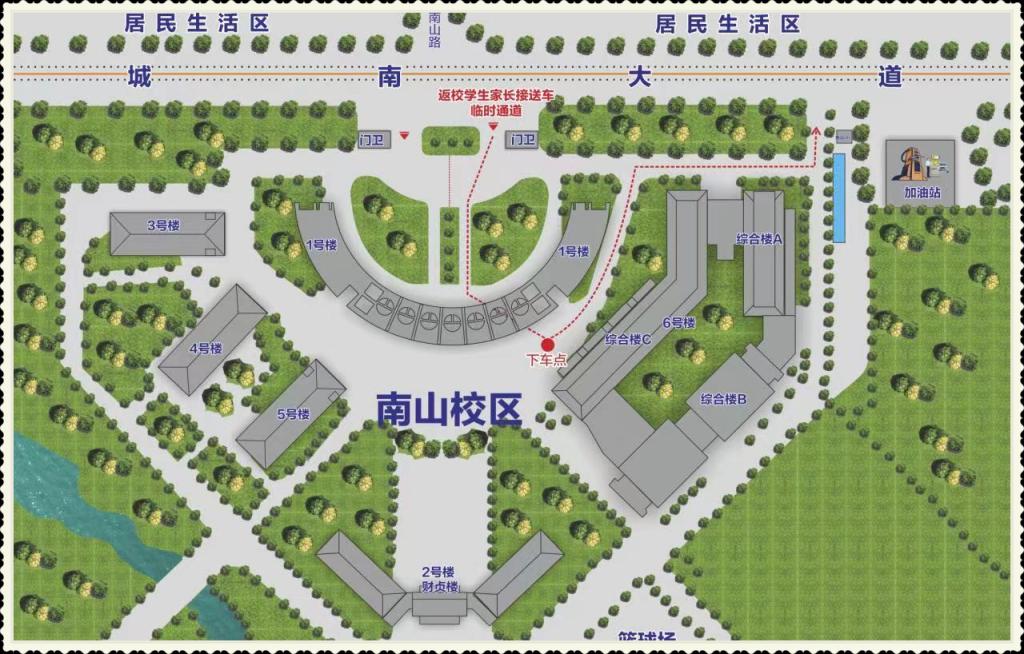 南山校区从正大门东侧门进校,在综合楼前下车,加油站侧门出校。