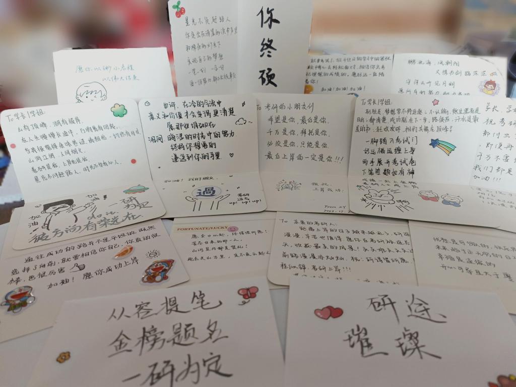 2022年12月25日的考研是与众不同的。“考研遇上疫情,对我们的心态也是极大的挑战。”新能源材料与器件191班曾敬添说,“我们学校及时发放了中药、口罩、消毒湿巾等各种防疫物资,后来还收到了学弟学妹们的祝福贺卡,我觉得非常非常贴心。”