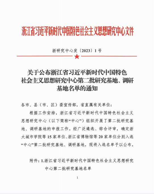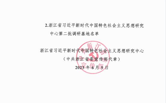 近日,经学校积极申报、省委宣传部组织专家遴选评审,浙江省习近平新时代中国特色社会主义思想研究中心公布了第二批研究基地、调研基地名单,我校获批浙江省习近平新时代中国特色社会主义思想研究中心研究基地。