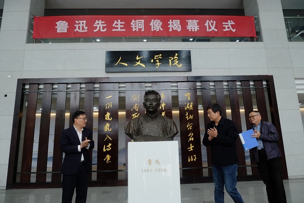 汪俊昌和人文学院院长李圣华共同为鲁迅铜像揭幕。